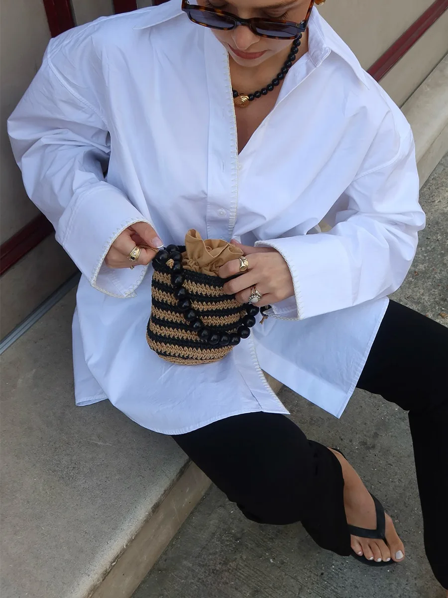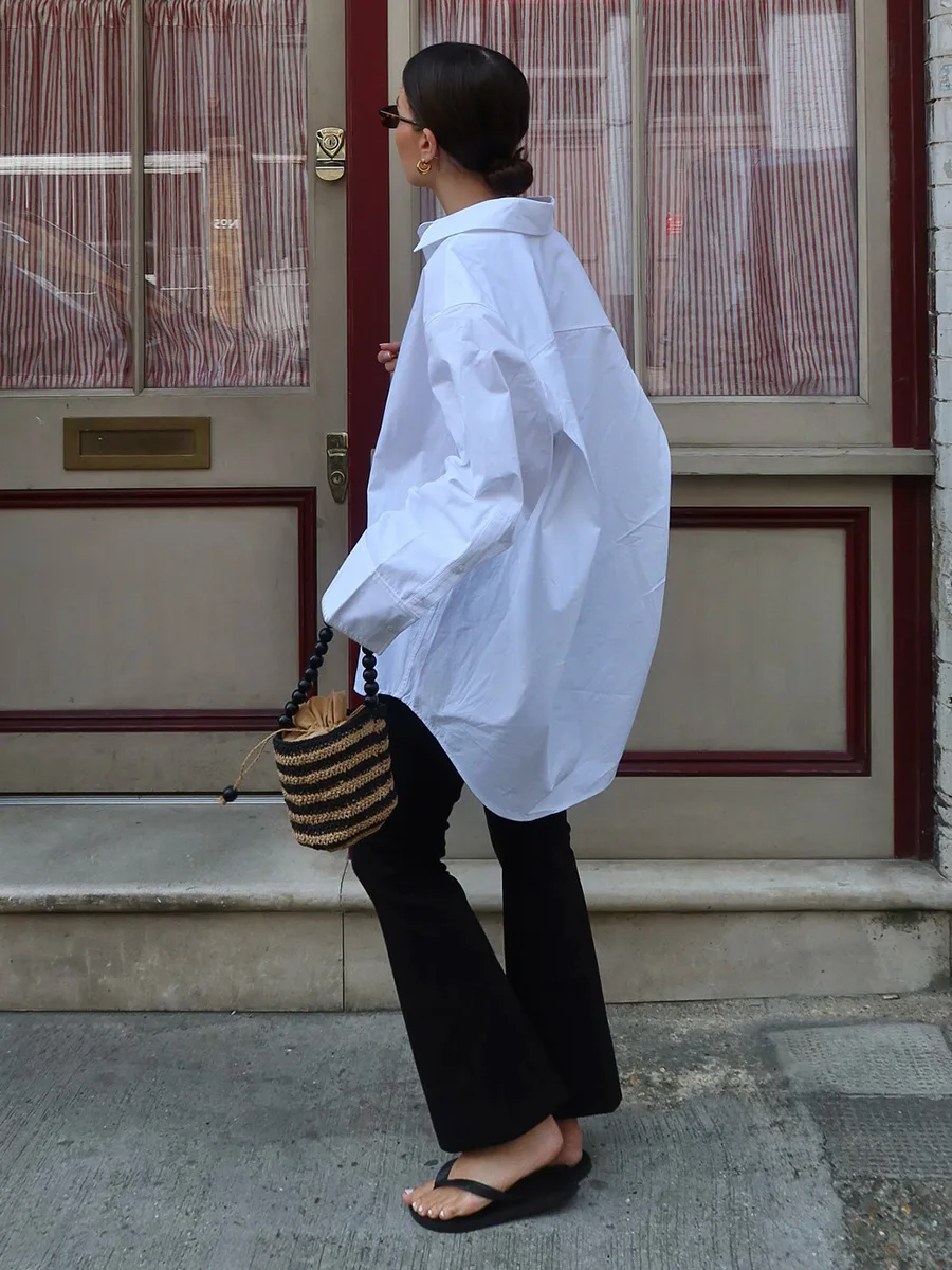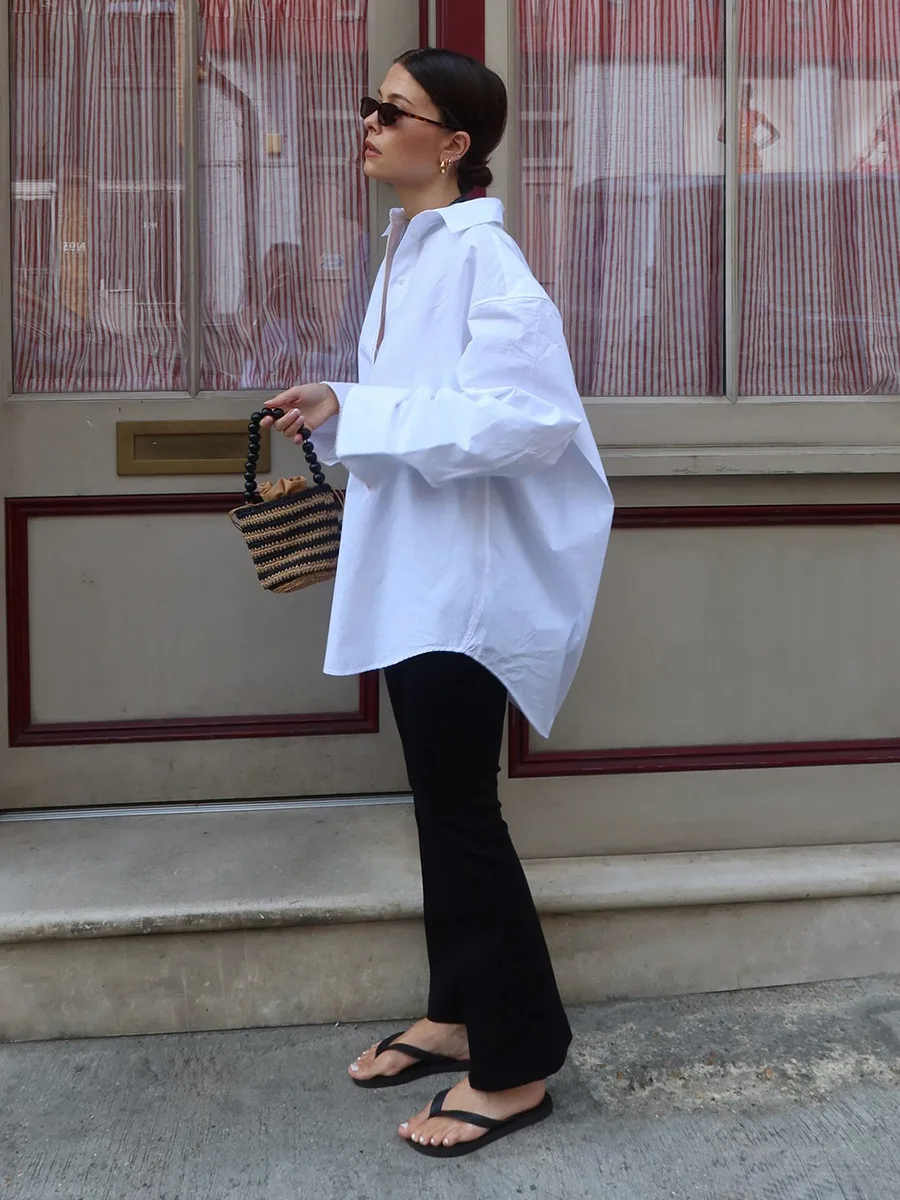 - Timeless Minimalist Design – Clean white shirt with lapel collar for a refined, effortless look.