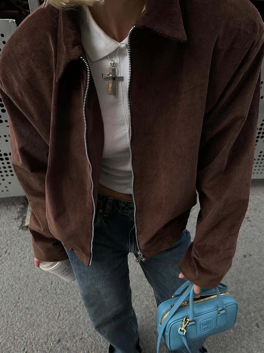 Women’s Retro Brown Corduroy Cotton Jacket – Zip-Up Lapel Collar Autumn Fashion Outerwear